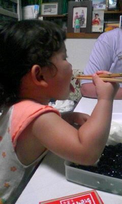 ビックリしたのは、箸使い!今までは掴んで刺す感じだったのが、ちゃんと握ってます。 豆も難なく掴んでたべてます。 上手でしょ?!