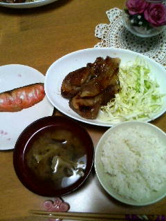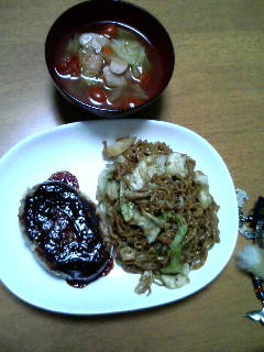 おからのふわふわハンバーグ→たまねぎ1/4をみじん切り。合い挽き肉コブシくらいの量。山芋5~6㌢摩り下ろす。おから大さじ4杯。 これをすべてボールに入れて、塩コショウ少々とともに混ぜ合わせる。 手のひらくらいの大きさになるので、それを油の引いたフライパンで焼く。ふたをして始め中火、表面が白くなったらひっくり返して弱火。焦げ目が付いてきたら強火にしてフライパンのふちでハンバーグの横を焼く・・・・・。 ソースはケチャップとソースを混ぜて火に通しただけ。ホントはワインとか入れるんだよね・・・。たしか。