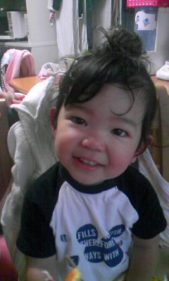 気温が高いので汗っかきの花帆に一つで髪を束ねて見たら、鏡をみて一言