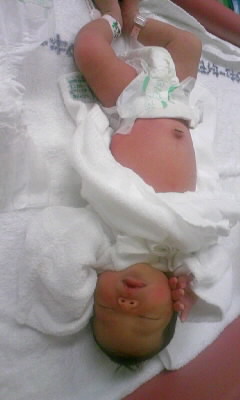 2:30→ご主人タマ陣痛室へ。意識モウロウ…陣痛多分30秒? 子宮口7cm いきみたくなる…ご主人タマの指握るが爪立てる(爪立てないでと言われるが返事できる訳がなく…)ベットで四つん這いになるが、痛みがくるとのけ反ってしまう。無理!お腹切ってと頼む